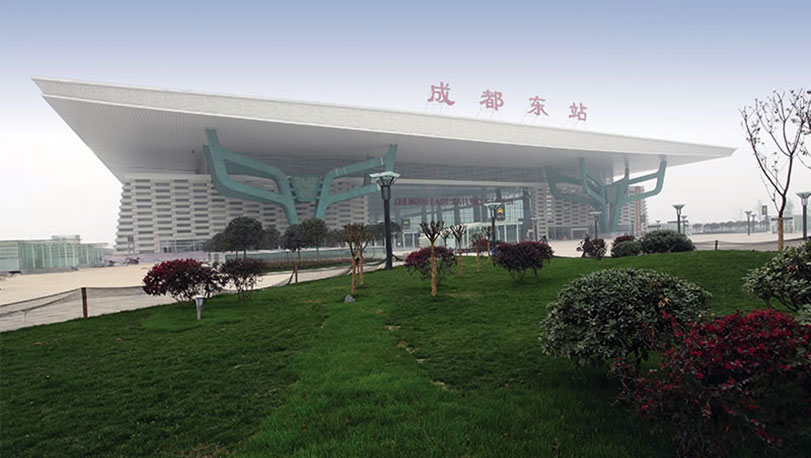 成都火車東站位于成都市東三環(huán)路,2010年開始建設,車站面積約22萬平方米。在設計上引入了大量的文化元素,東、西廣場的進出口都用了三星堆的青銅面具元素,屋頂引入了金沙太陽神鳥的火焰造型,被定為一等客運站。使用了寶鋼鍍鋁鋅
