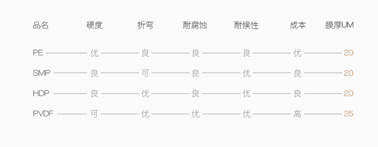 彩色鋼板最常用的面漆種類有:聚酯(PE),硅改性聚酯(SMP),高耐久性聚酯(HDP),聚偏氟乙烯(PVDF),每種面漆適應(yīng)不同的情況,在經(jīng)濟(jì)允許的情況下我們建議使用HDP或者PVDF的產(chǎn)品。