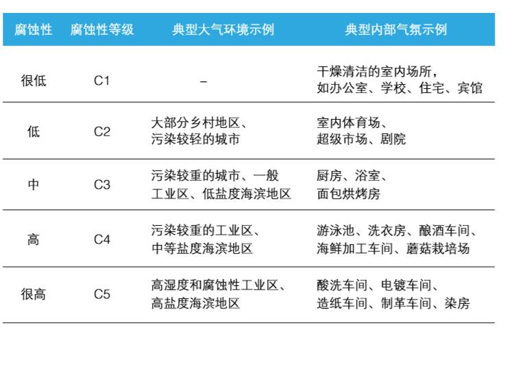 我國國家標(biāo)準(zhǔn)GB/T19292.1根據(jù)碳鋼、鋅、鋁等金屬第一年腐蝕速率測量值對大氣腐蝕性進(jìn)行了分類,但是彩涂板還缺乏使用環(huán)境(指大氣環(huán)境和內(nèi)部氣氛)腐蝕性分類的數(shù)據(jù),僅定性的將大氣環(huán)境和內(nèi)部氣氛腐蝕性分為5個等級即C1、C2、C3、C4、C5,其腐蝕性依次增強,表示給出了不同腐蝕性等級對應(yīng)的典型大氣環(huán)境和內(nèi)部氣氛。