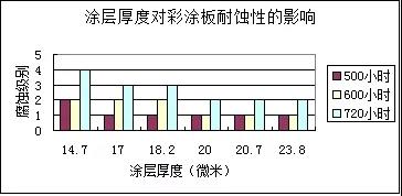 從微觀上講、涂層是多空的組織??諝庵械乃⒏g介質(zhì)(氯離子等)就會(huì)通過(guò)涂層的薄弱部分侵入,造成膜下腐蝕,進(jìn)而涂層起泡并剝落。另外,即使同樣涂層厚度,二次涂層要比一次涂層致密。根據(jù)國(guó)外報(bào)道和相關(guān)腐蝕試驗(yàn)結(jié)果,正面涂層20μm以上才能有效的防止腐蝕介質(zhì)的侵入,由于底漆和面漆的防腐蝕機(jī)理不同,不僅要規(guī)定總膜厚,還有分別要求底漆(》5μm)和面漆(》15μm)的厚度,只有這樣,才能保證彩涂鋼板不同部位的耐蝕性是均衡的。